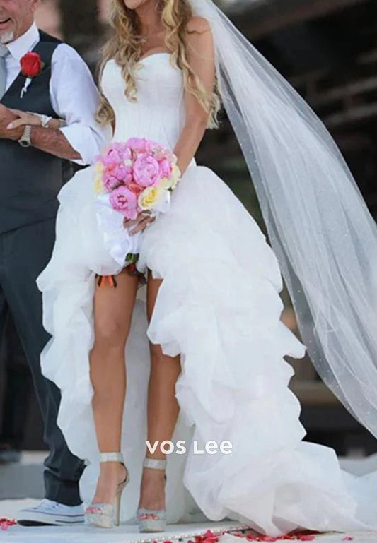 High Low A-Line Strapless Sweetheart Pleated Beach Wedding Dresses with Court Train