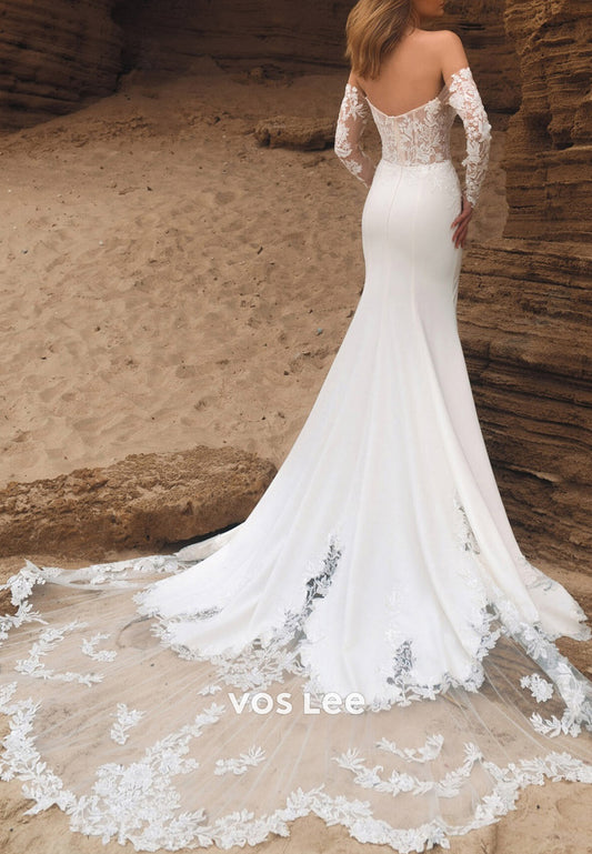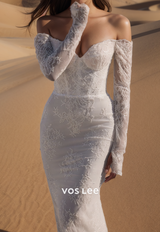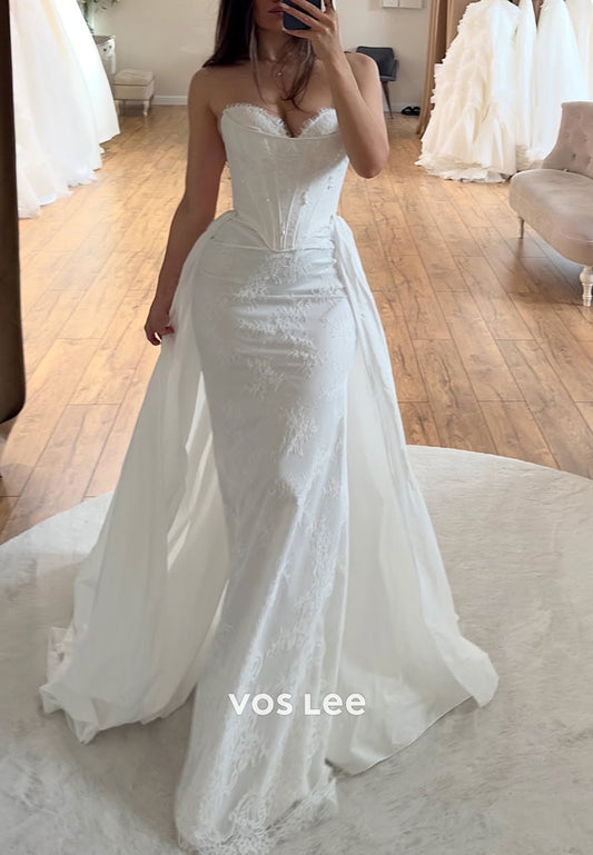 Detachable Long Sleeve Sweetheart Lace Appliques Mermaid Wedding Dresses with Court Train