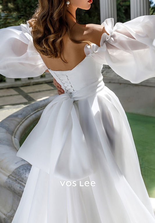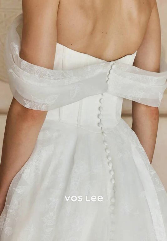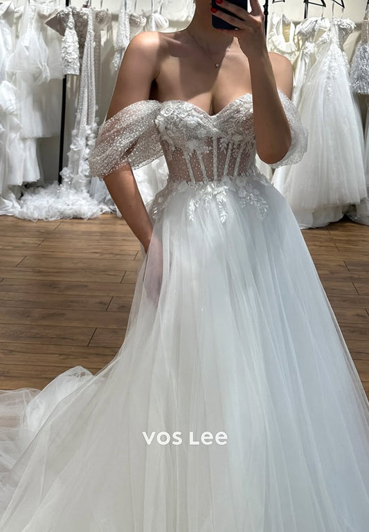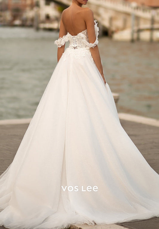 A-Line Off the Shoulder Sweetheart Split Appliques Lace Wedding Dresses with Court Train