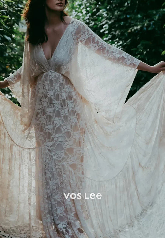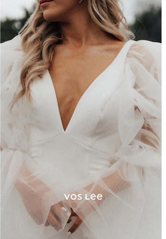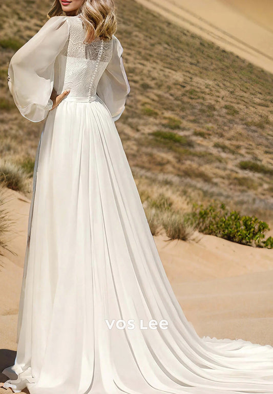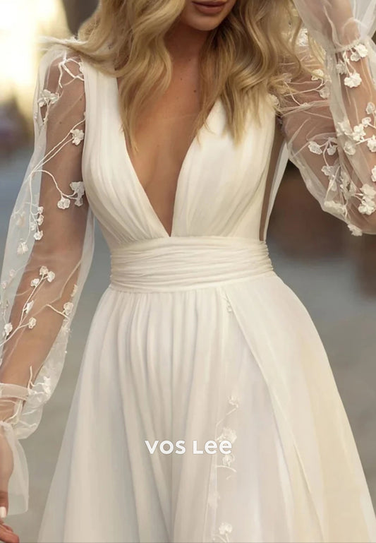 A-Line Long Sleeve Plunging V-Neck Illusion Split Beach Wedding Dresses with Sweep Train