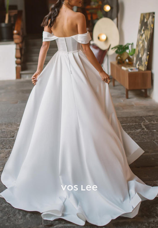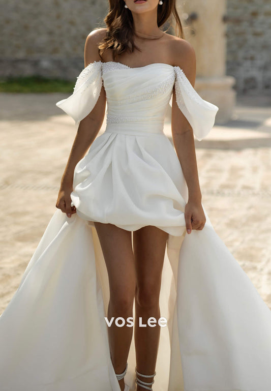 Simple Off the Shoulder Sweetheart pearls Pleated Wedding Dresses with Court Train