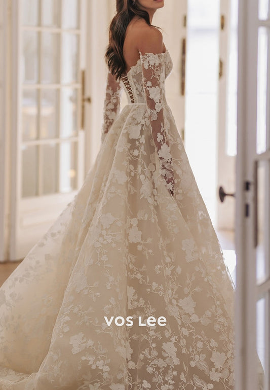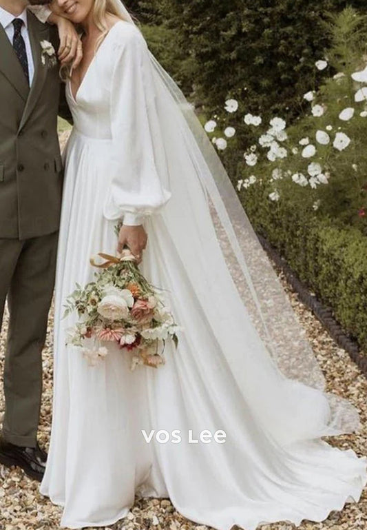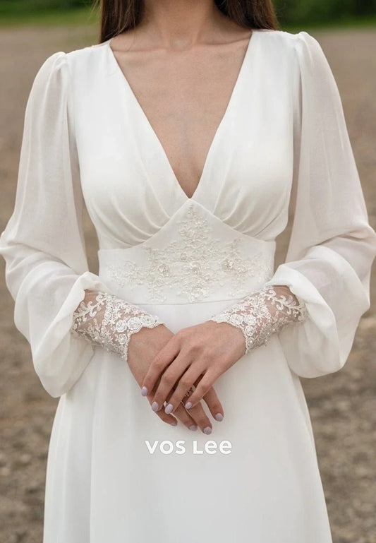 A-Line Plunging V Neck Appliques Lace Long Sleeve Wedding Dresses with Sweep Train