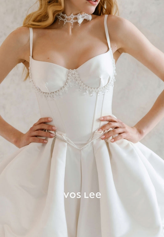 Mini & Short A-Line Spaghetti Straps Sweetheart Pearls Pleated Beach Wedding Dresses
