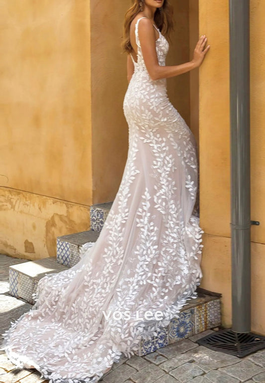 V Neck Spaghetti Straps Appliques Lace Mermaid Wedding Dresses with Sweep Train