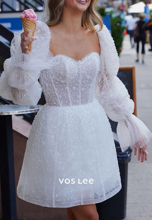 Sparkly A-Line Detachable Long Sleeve Sweetheart Fully Beaded Short Wedding Dresses