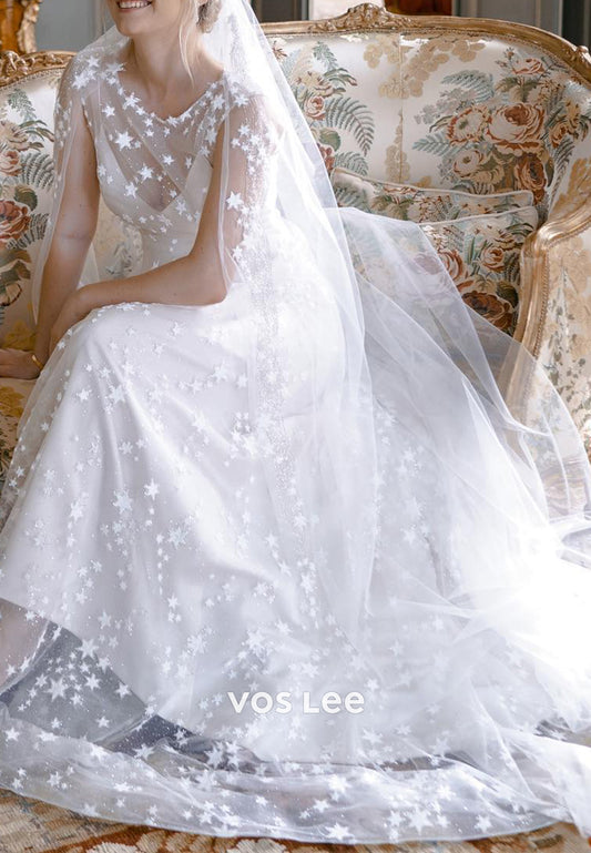 A-Line Cap Sleeves Scoop Appliques Lace Beach Tulle Wedding Dresses with Court Train