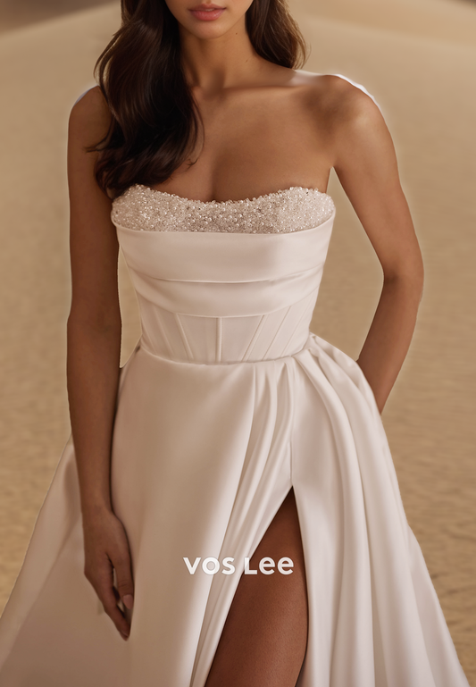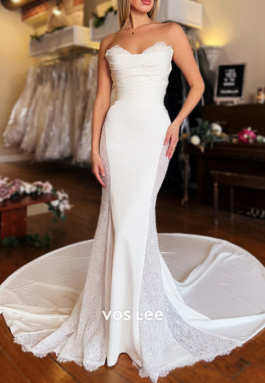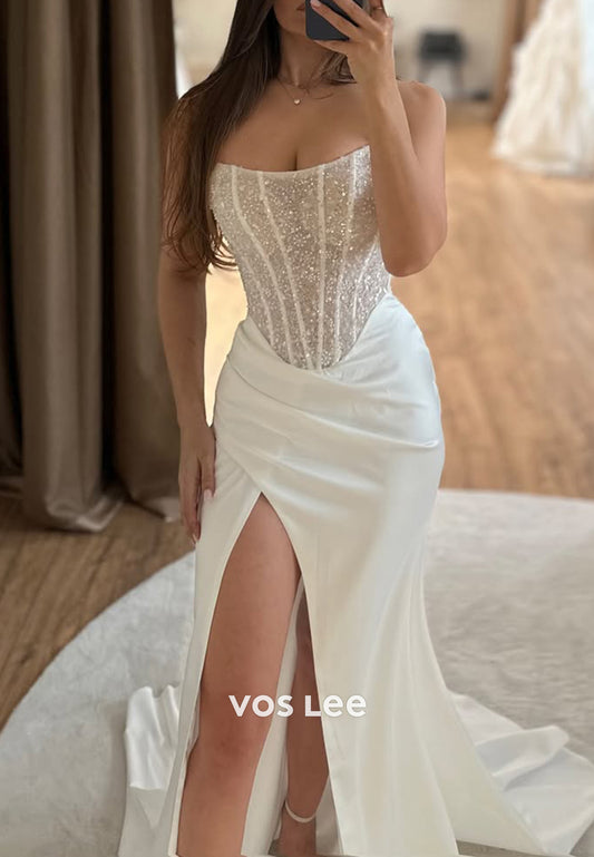 Sparkle & Shine Strapless High Split Pleated Mermaid Wedding Dresses with Sweep Train