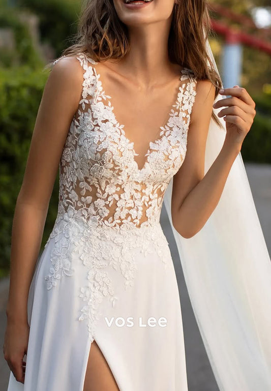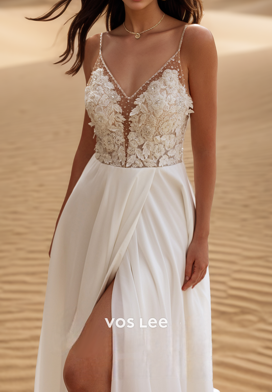 Classic & Simple V Neck Appliques Lace Sheath Beach Wedding Dresses with High Split