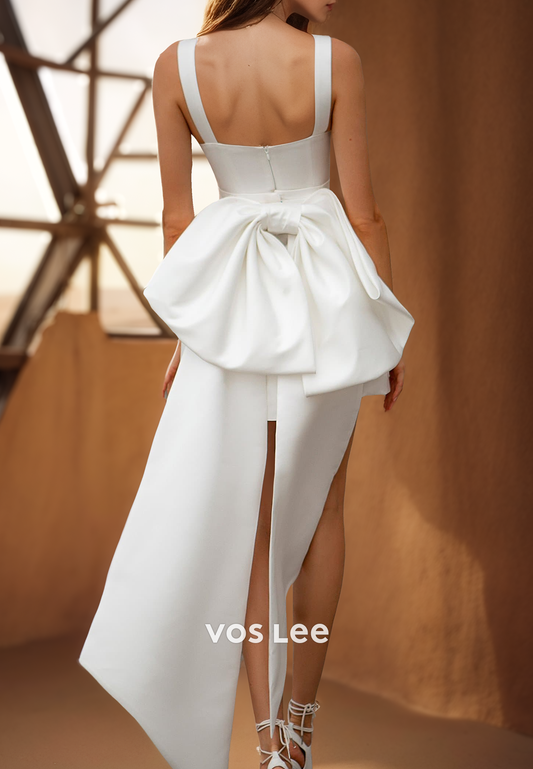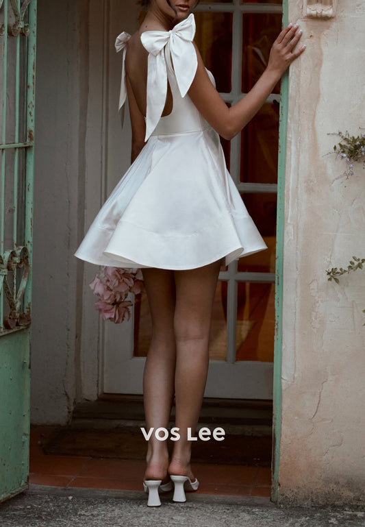 Mini & Short A-Line Square Bowknot Sleeveless Pleated Satin Maxi Wedding Dresses