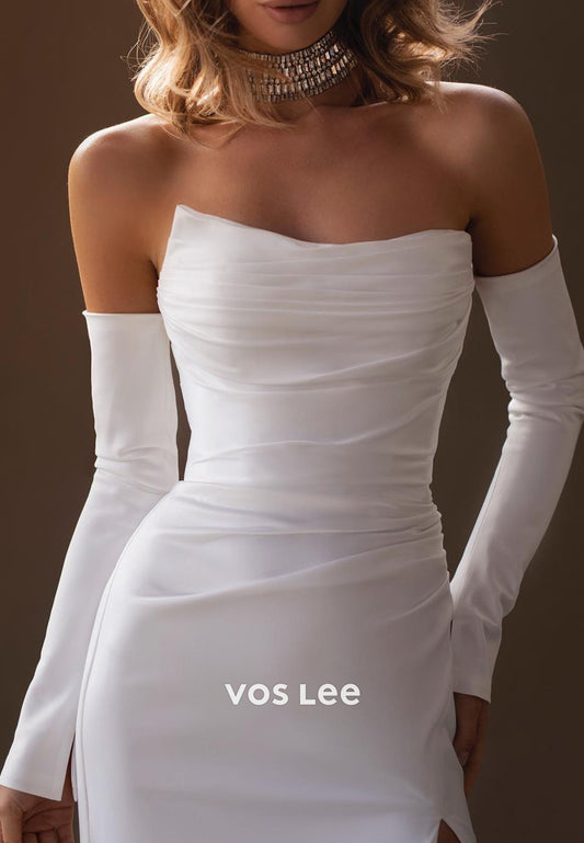 Long Sleeve Strapless Satin Pleated Mermaid Wedding Dresses with Sweep Train