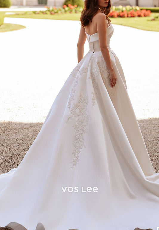 A-Line Strapless Appliqued Pleated Long Classic Wedding Dresses with Court Train