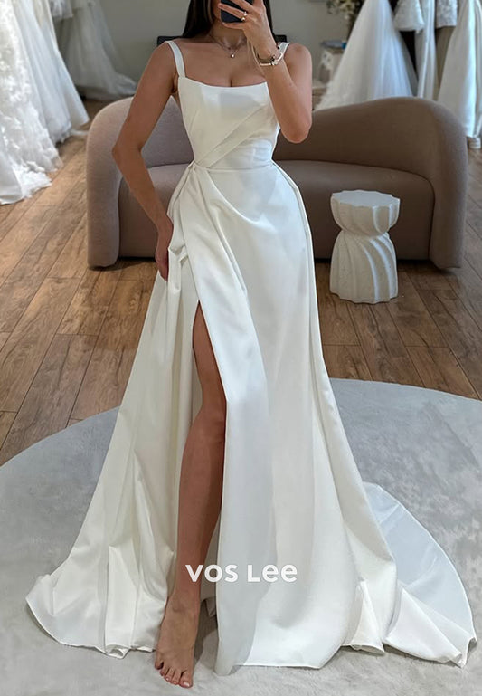 A-Line Square Spaghetti Straps Pleated Simple Beach Wedding Dresses with High Slit