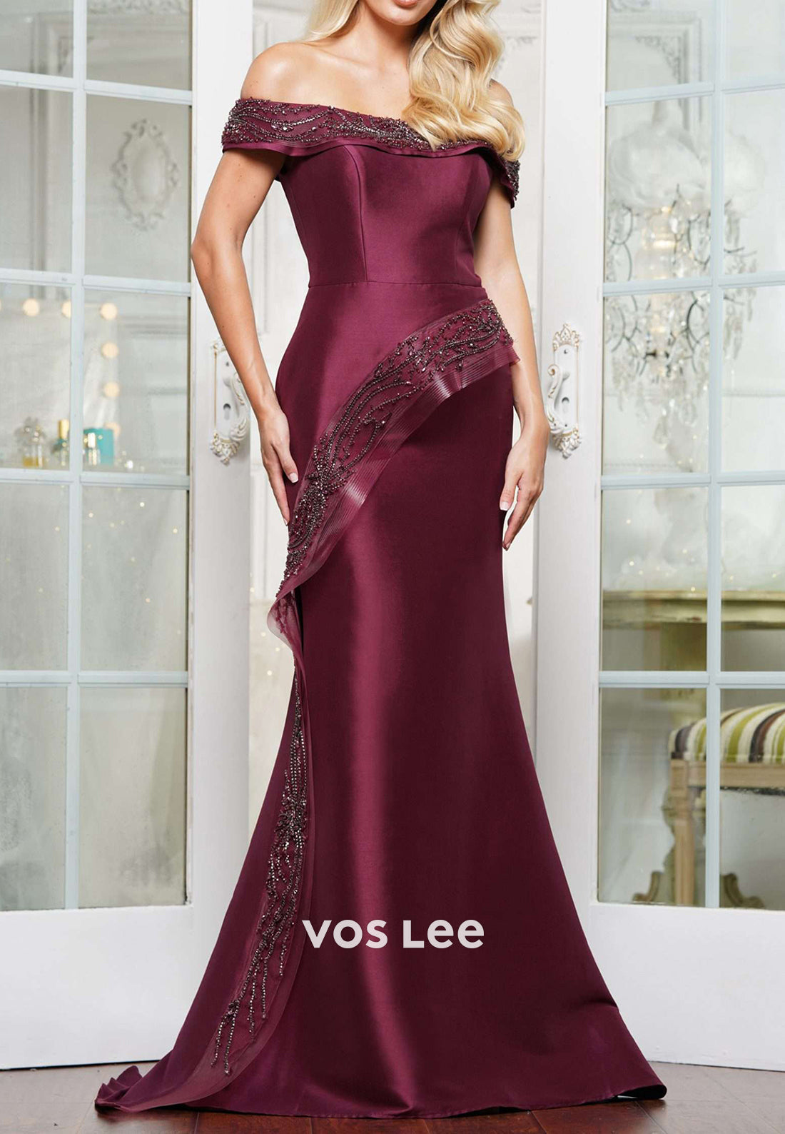 This off-the-shoulder mother of the bride dress features exquisite beading that enhances its luxurious mermaid silhouette. The fitted design elegantly contours the body, while the sweep train adds a touch of drama and sophistication. Perfect for a refined and memorable look on your special occasion.