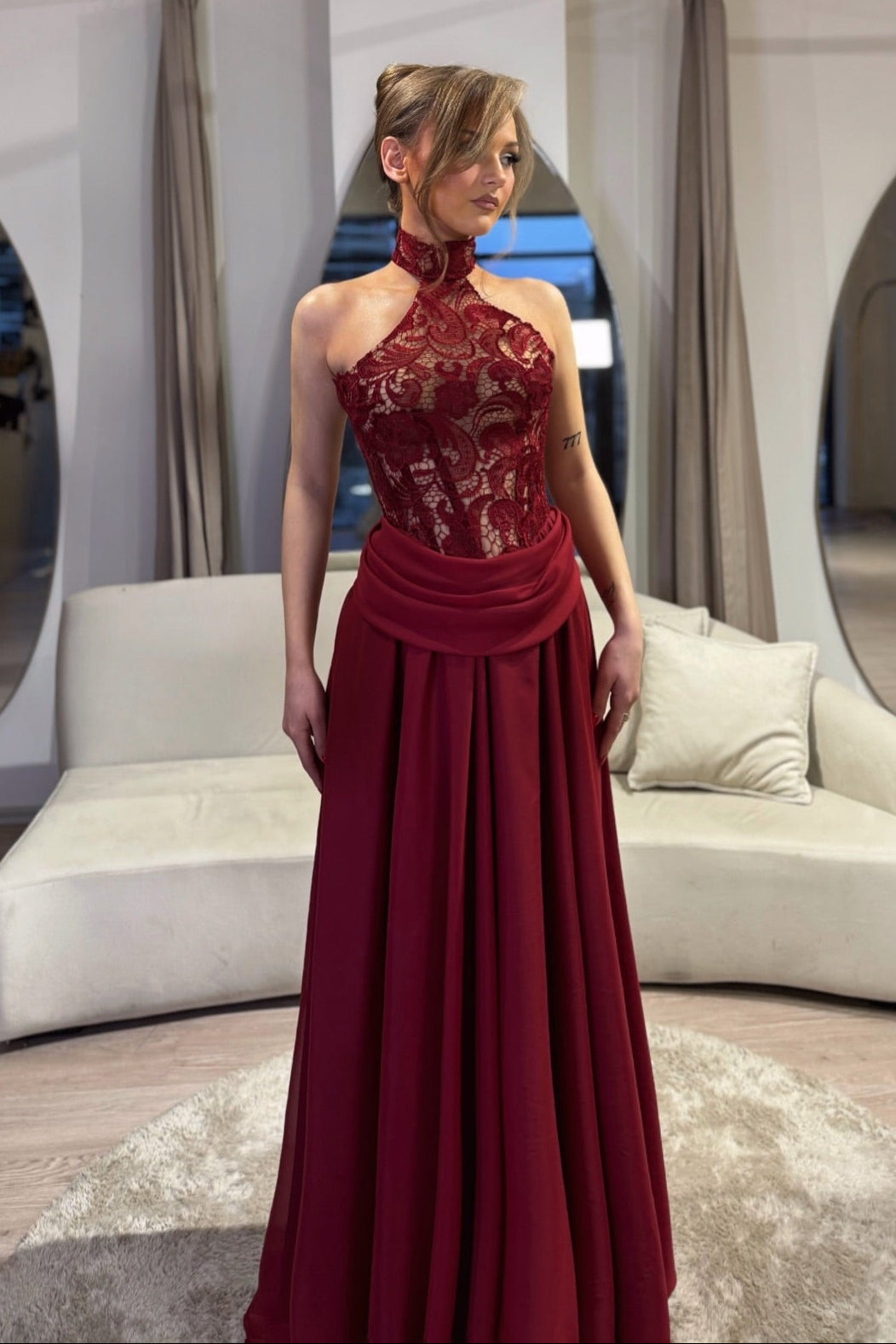 Burgundy Lace Halter Gown | A-Line Formal Evening Dress