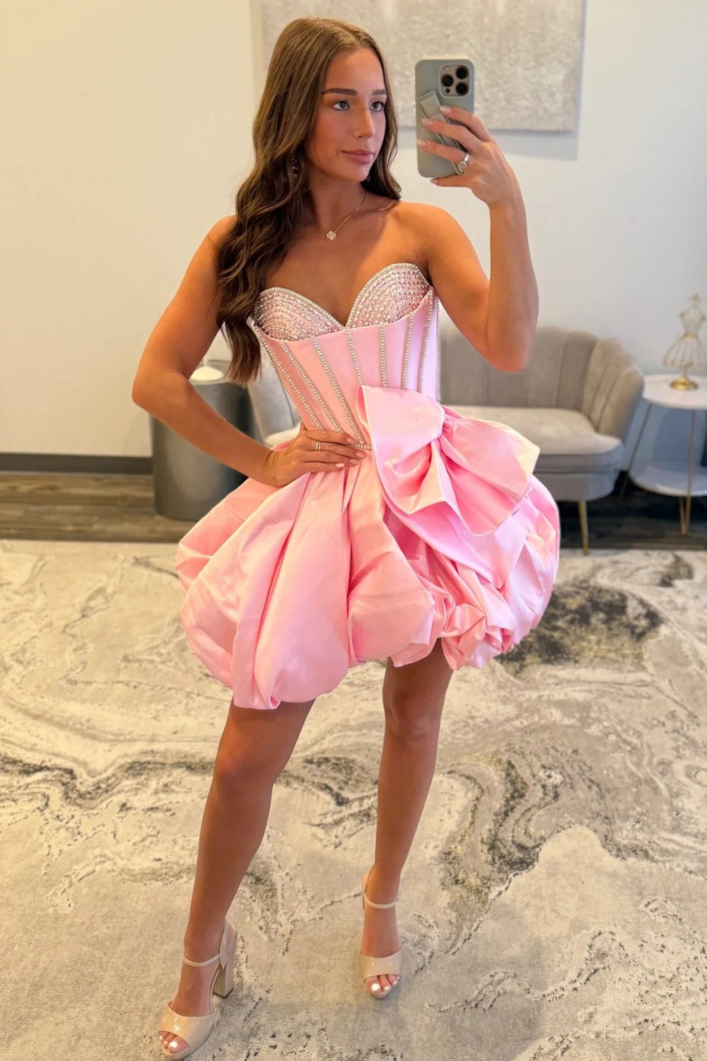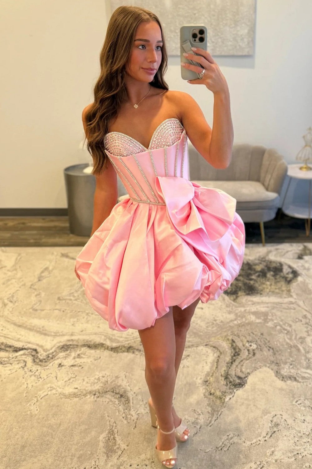 Pink Bubble Hem Homecoming Dress with Rhinestone Corset Bodice and Bow