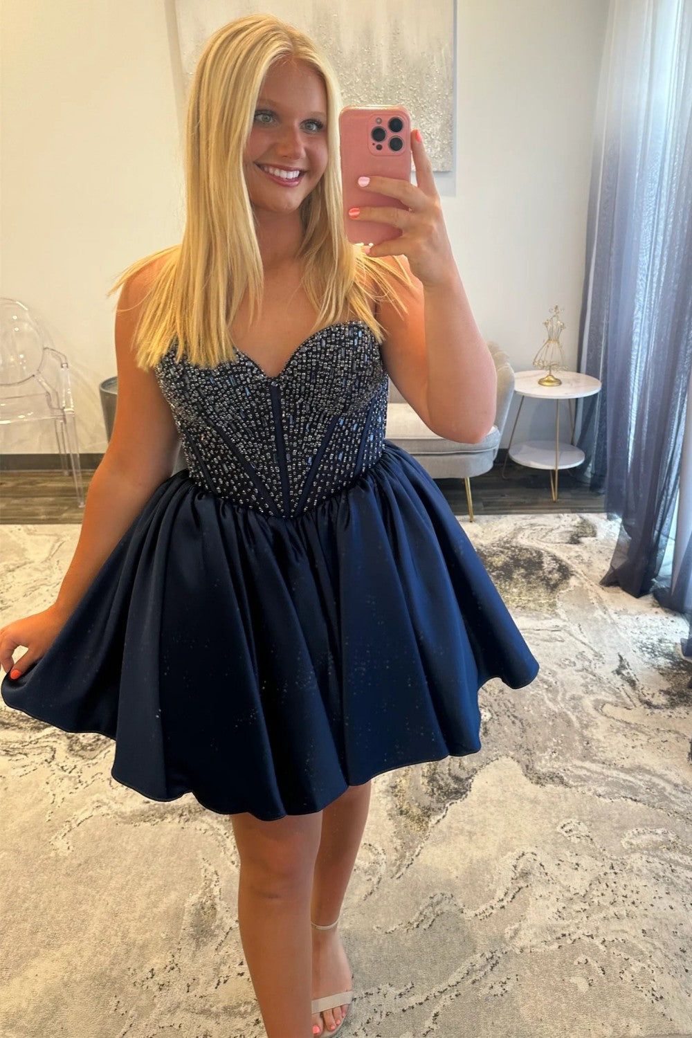 Satin Homecoming Dress with Beaded Corset Bodice and Sweetheart Neckline
