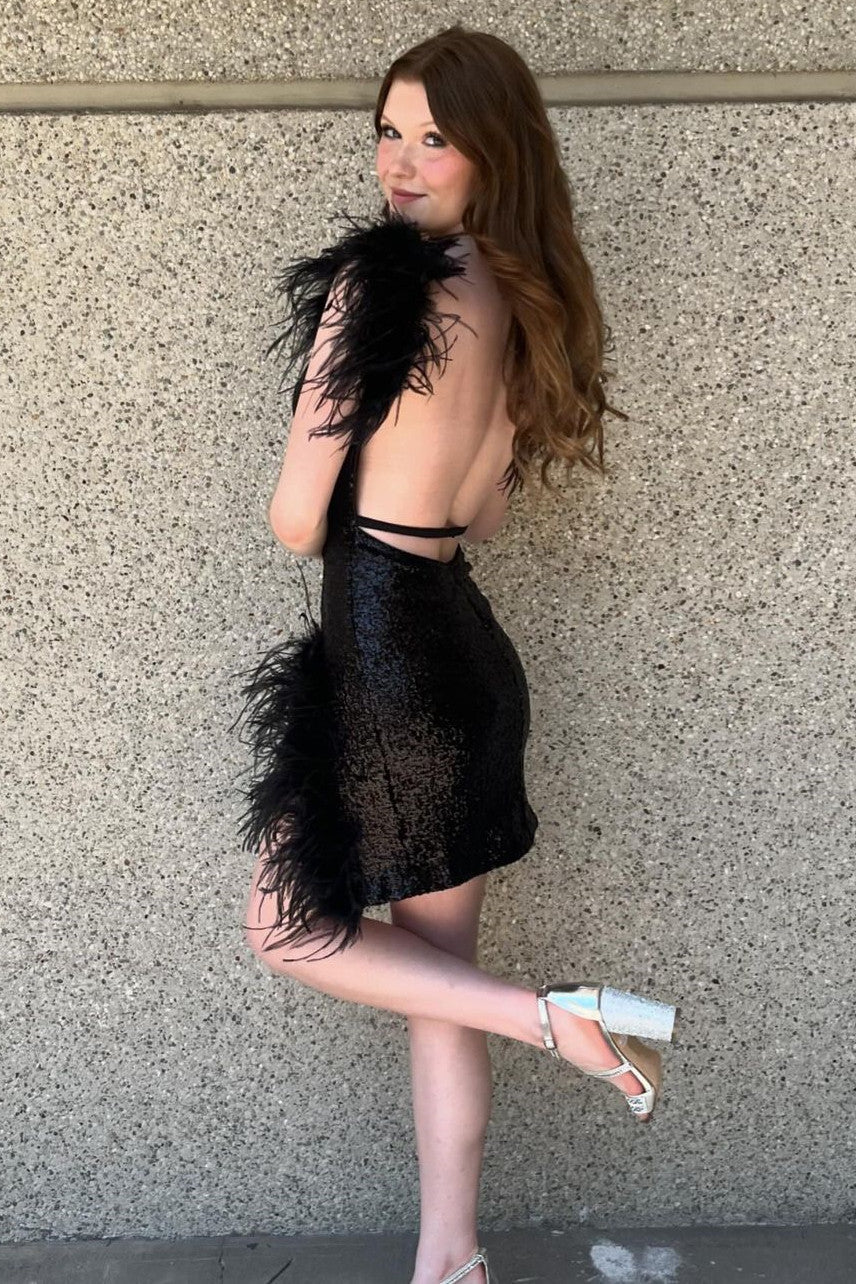 Sexy Black V-Neck Short Glitter Homecoming Dress With Feather x 1;