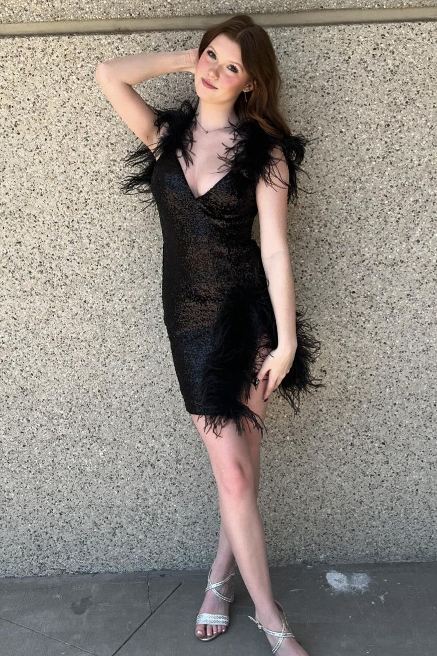 Sexy Black V-Neck Short Glitter Homecoming Dress With Feather