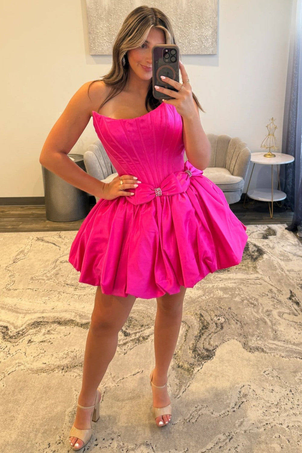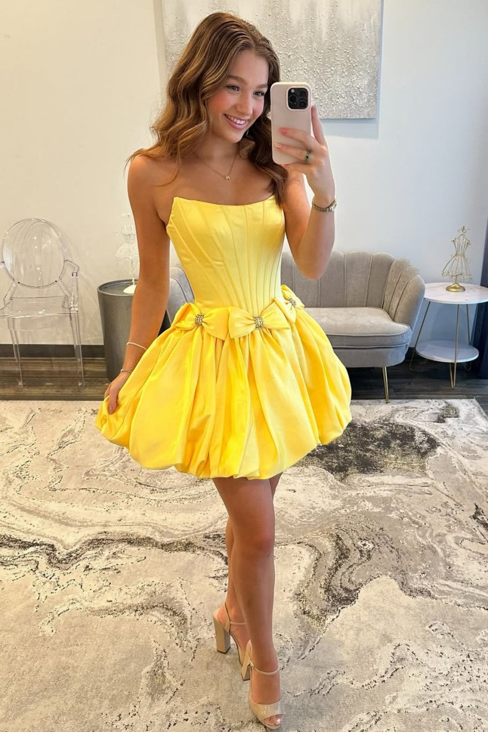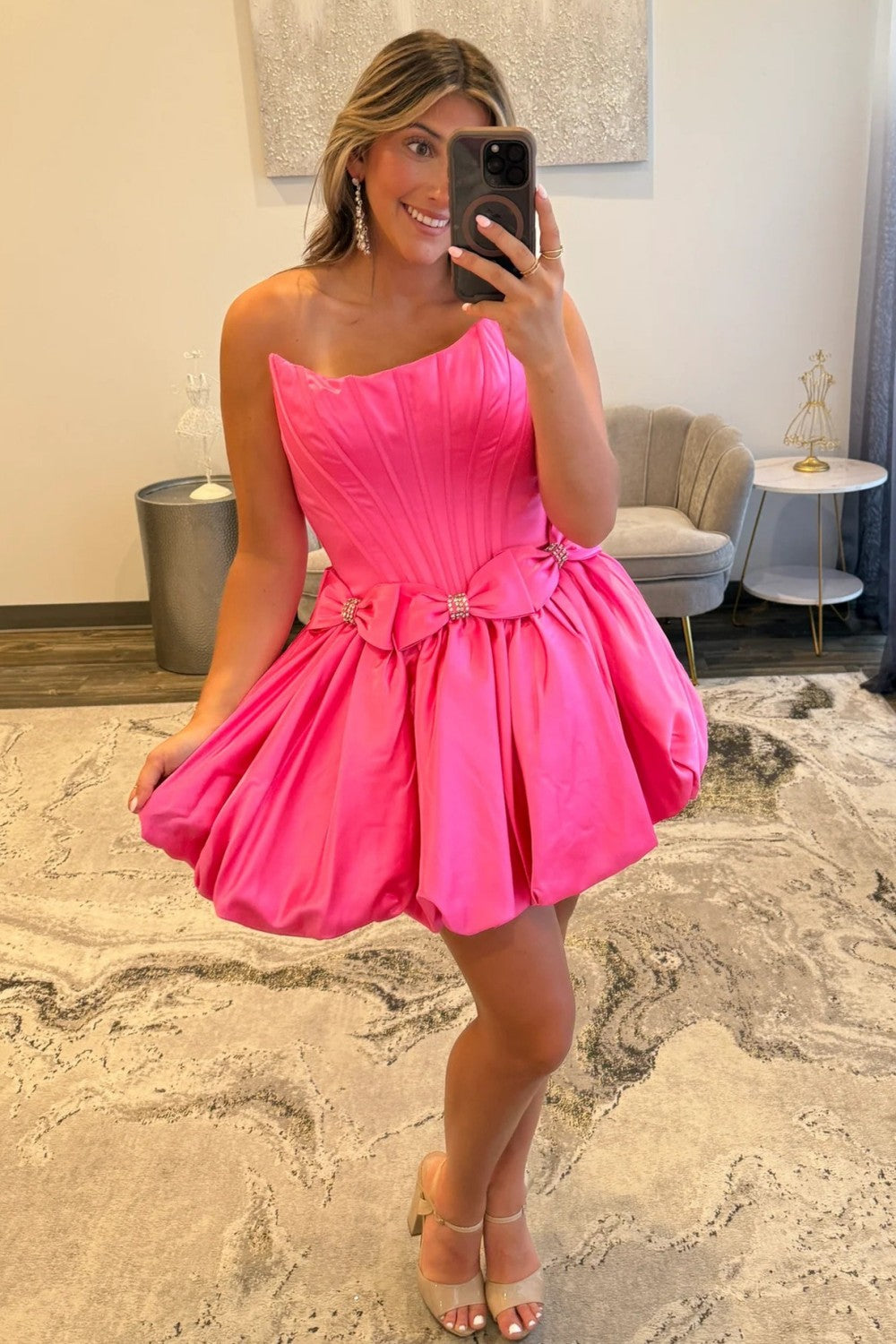 Strapless Satin Bubble Hem A-Line Homecoming Dress with Bow Accents