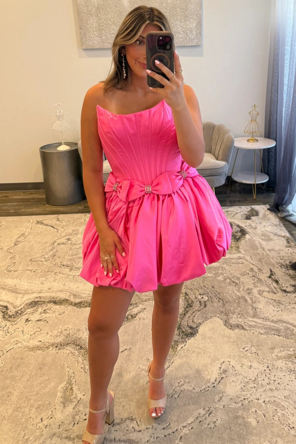 Strapless Satin Bubble Hem A-Line Homecoming Dress with Bow Accents x 1;