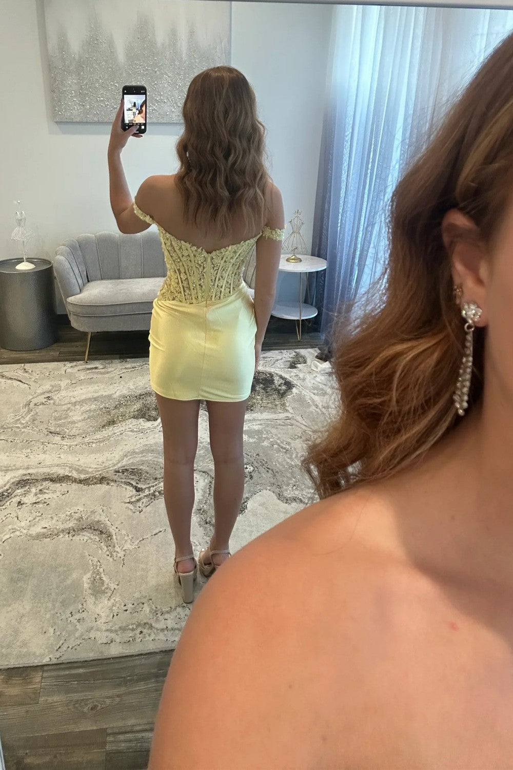 This stylish blue bodycon dress features an off-the-shoulder design with a structured corset bodice adorned with delicate appliques. The fitted silhouette enhances your figure, while the intricate detailing adds a refined touch, making it an excellent choice for a sophisticated homecoming look.