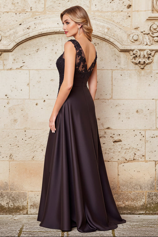 A Line Lace Appliqued Black V Neck Mother of the Bride Dress