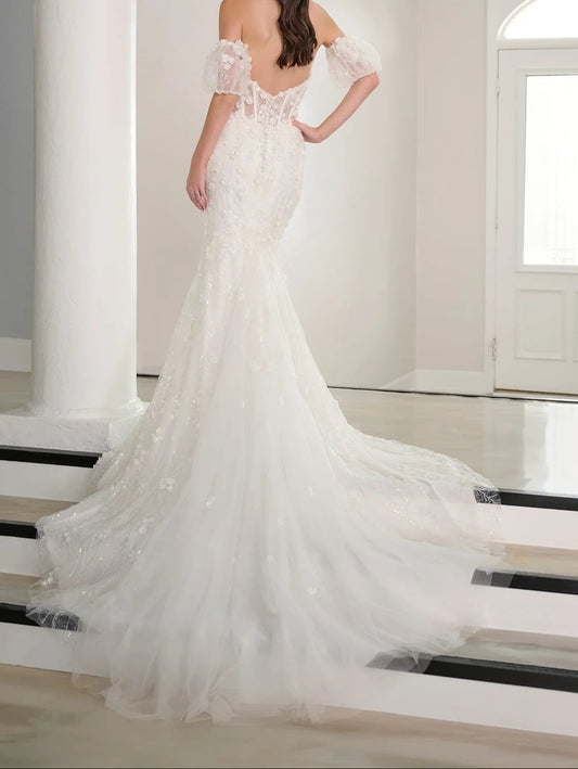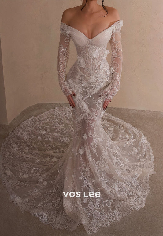 3D Floral Sheer Lace Wedding Dress Off-Shoulder Mermaid Bridal Gown