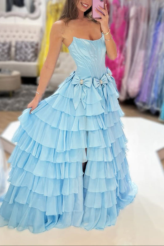 A Line Scoop Neck Light BlueTiered Chiffon Prom Dress with Bow