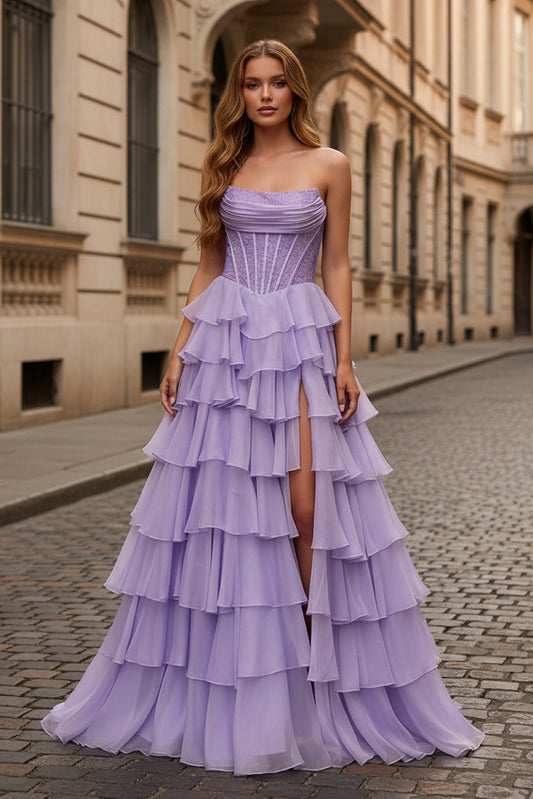 A Line Lavender Strapless Chiffon Beaded Corset Long Prom Dress With Slit