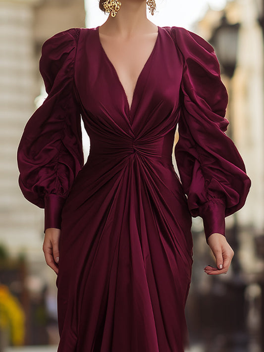 Vintage V Neck Long Sleeves Back Zipper Ruched Side Split Mother of the Evening Dress