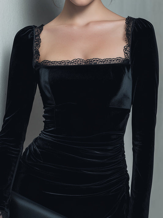 Vintage-Inspired Black Velvet Lace-Trimmed Sheath Midi Dress