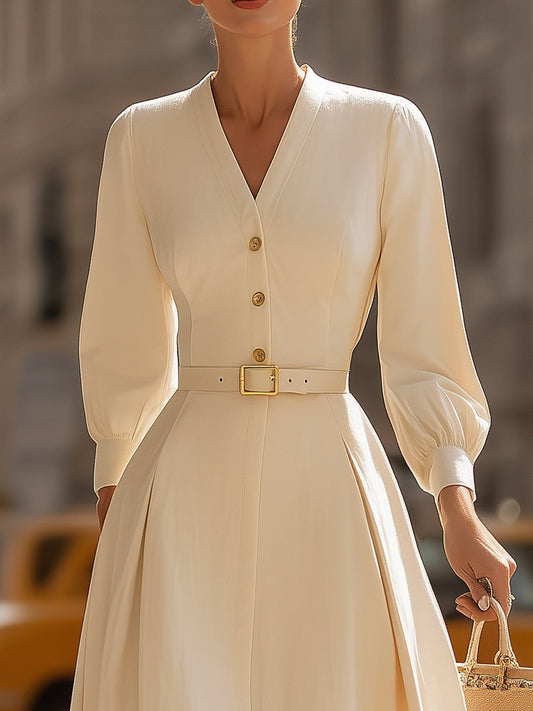 VOS LEE Minimalist Balloon Sleeve Midi Dress In Cream Beige