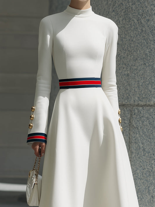 White Long-Sleeve A-Line Dress With Stripe Detail