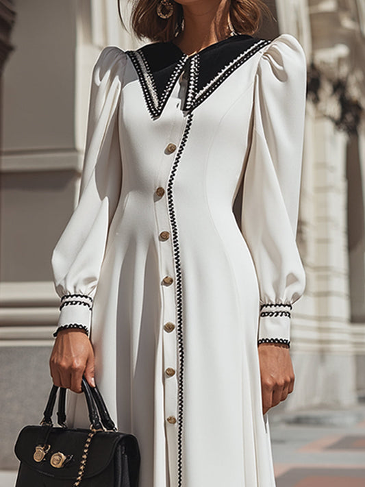 White Contrast-Collar Fit-and-Flare Zip-Front Dress