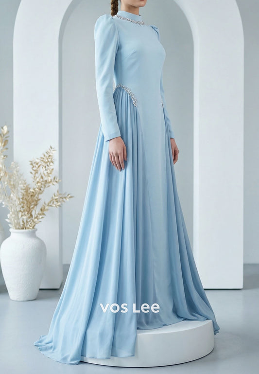Navy Blue O-Neck Long Sleeves A Line Beading Diamonds Long Evening Dress Wedding Guest Dress