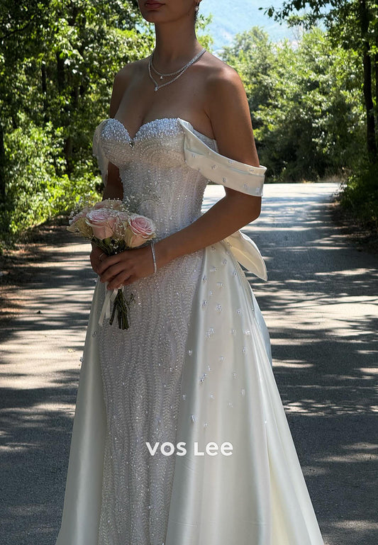 Off the Shoulder Beaded Mermaid Wedding Dresses with Bowknot