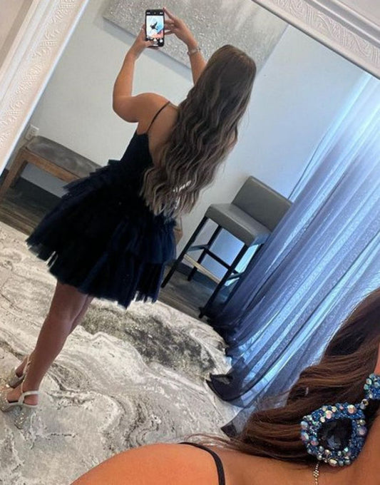 A-Line Spaghetti Straps Navy Tulle Homecoming Dress