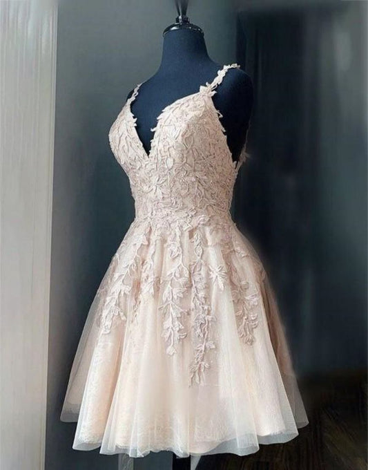Sexy V Neck Spaghetti Straps Lace Homecoming Dress With Applique