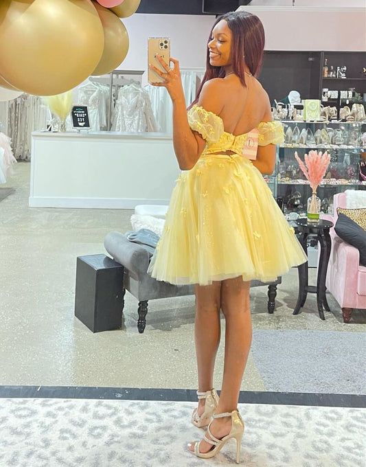 Yellow Off The Shoulder Homecoming Dress With Appliques