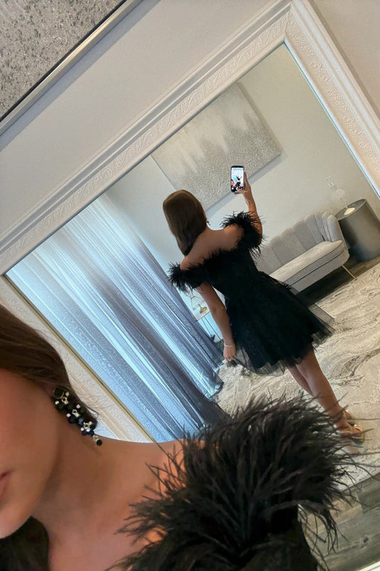 Elegant A Line Off the Shoulder Black Short Homecoming Dress with Feather
