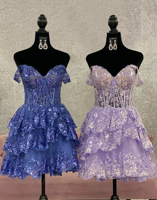 Cute Lilac A-Line Sweetheart Short Tiered Lace Top Homecoming Dress