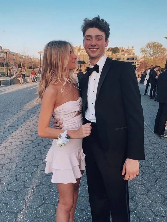 Blush Pink Strapless Lace Homecoming Dress with Satin Bow and Corset Bodice