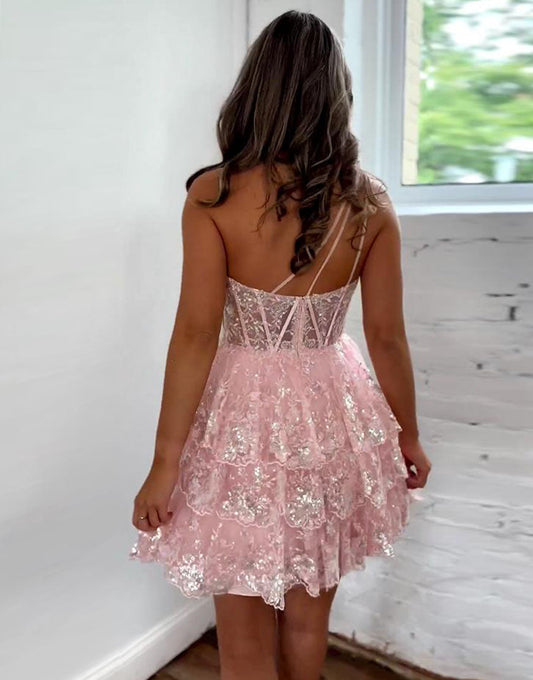 Glitter One-Shoulder Hot Pink Homecoming Dress With Sequins