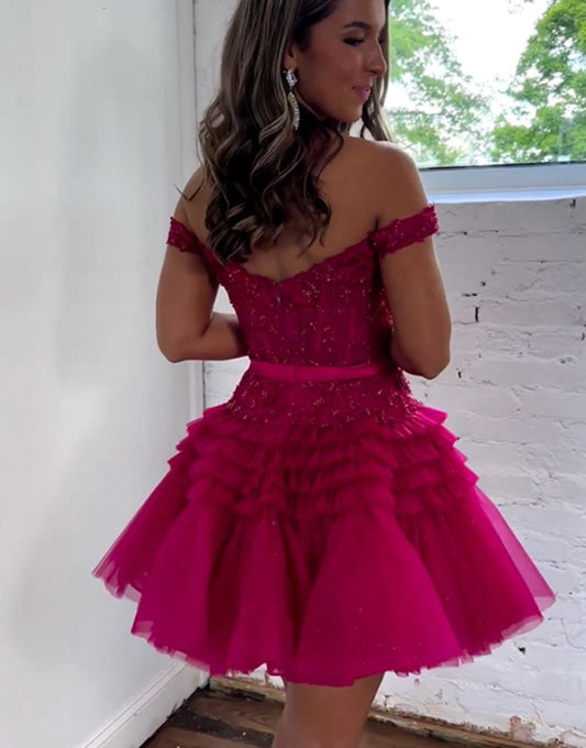 Sparkly Red Off The Shoulder A-Line Tiered Short Party Dress