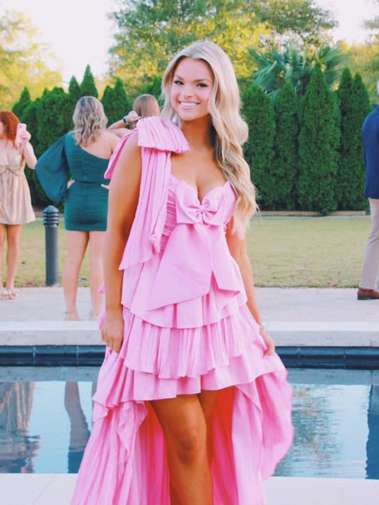 Touching A Line Spaghetti Straps Pink High Low Homecoming Dress with Bowknot