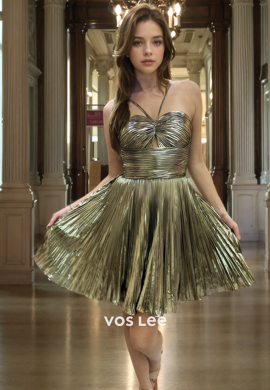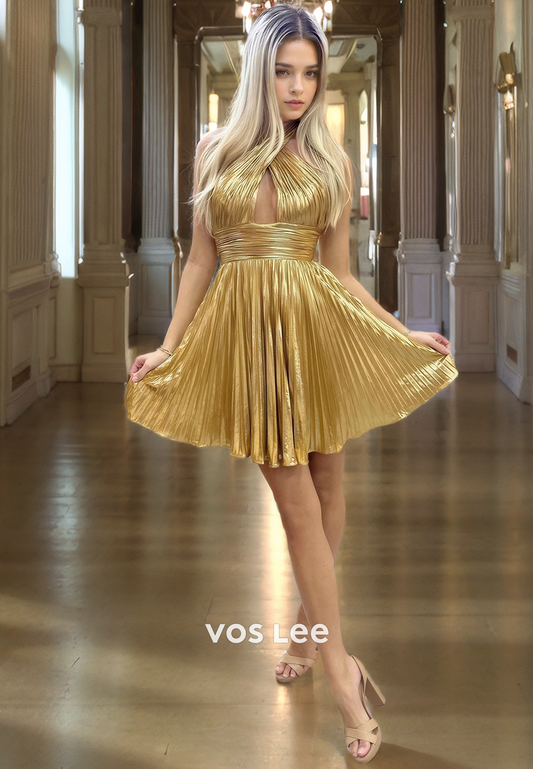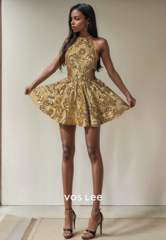 Charming Halter Backless Mini Party Dress Gold Elegant Homecoming Dresses