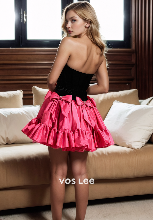 Pretty Strapless Mini Beads Bow Homecoming Dress Velour Short Sexy Party Dresses