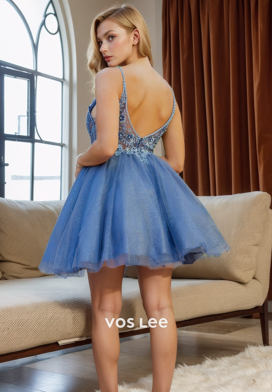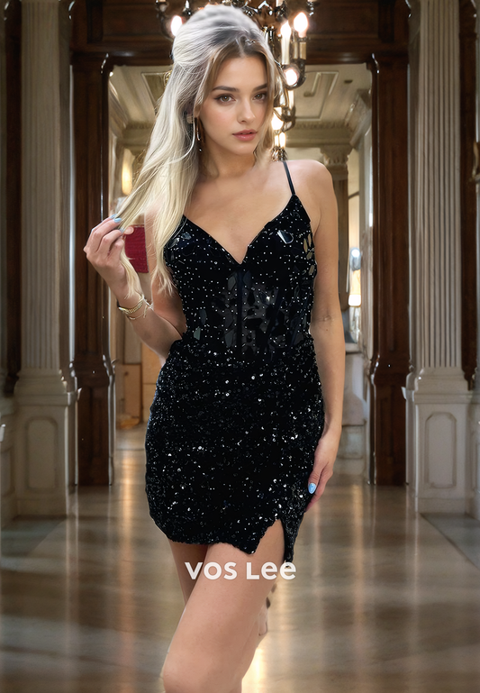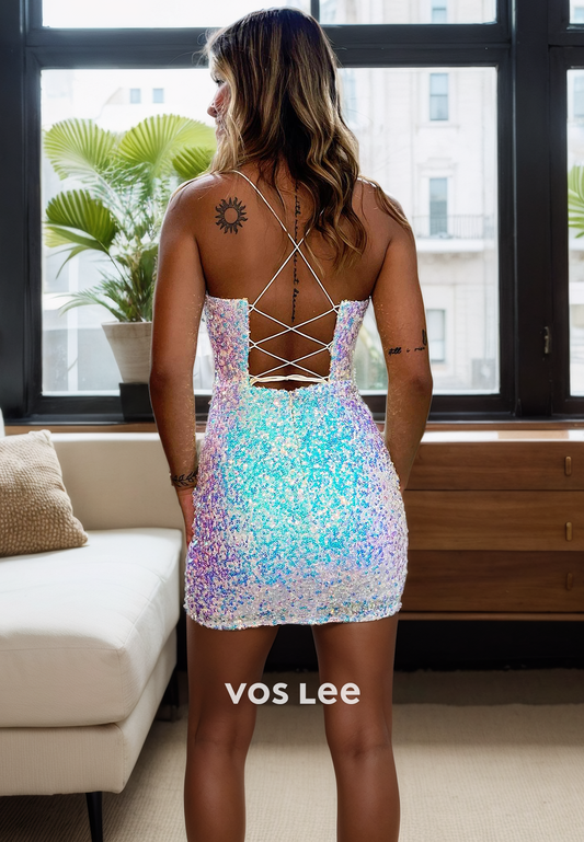 Classy Sparkly Fully Sequin Party Dress V-Neck Spaghetti Homecimng Dress