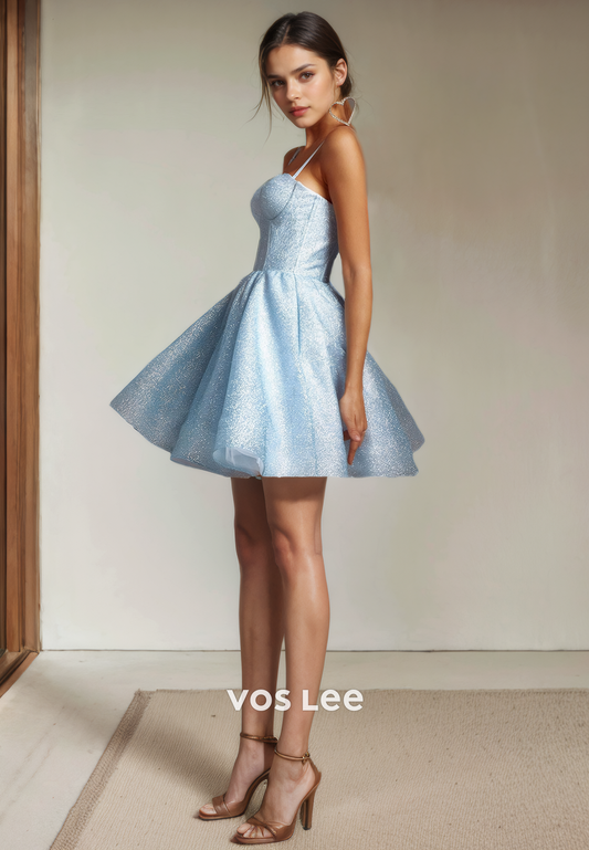 Sparkly Pleated Satin A-Line Sweetheart Spaghetti Straps Short Homecoming Dress