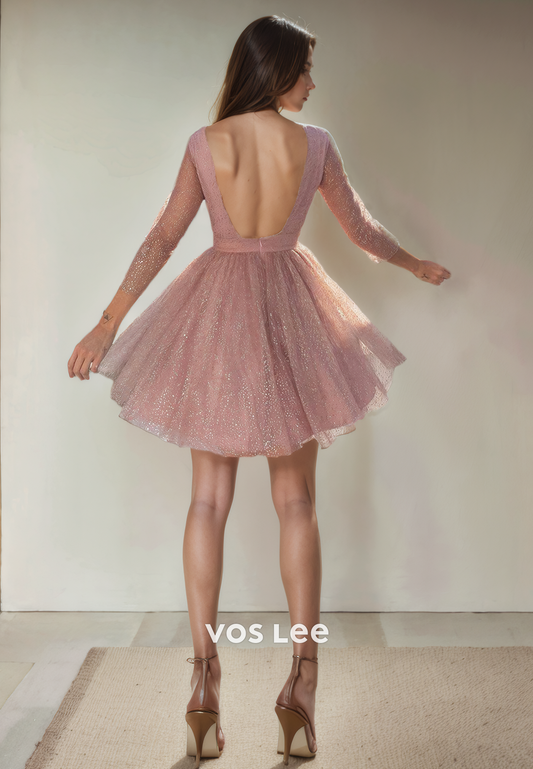 Pretty Scoop A-Line Tulle Backless Baby Pink Homecoming Dress with Long Sleeves